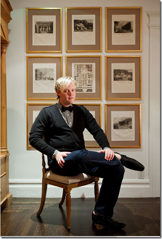 The boyishly handsome 6’4” tall Grant Gibson sits in front of series of architectural prints in his apartment. Grant took the illustrations from a book and then placed them in $20. matching frames. The apartment is full of his great buys mixed in with rarefied antiques. Together, it makes for a beautiful and very sophisticated living space.